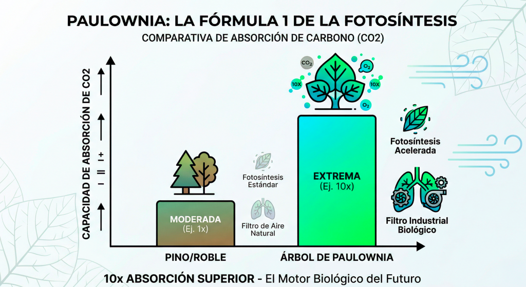 No hay máquina en el mundo más eficiente para secuestrar carbono que un árbol, y la Paulownia es el motor de Fórmula 1 de esta tecnología natural. Al absorber hasta 10 veces más CO2 que otras especies, no estamos plantando adornos, estamos instalando filtros industriales de aire puramente biológicos.